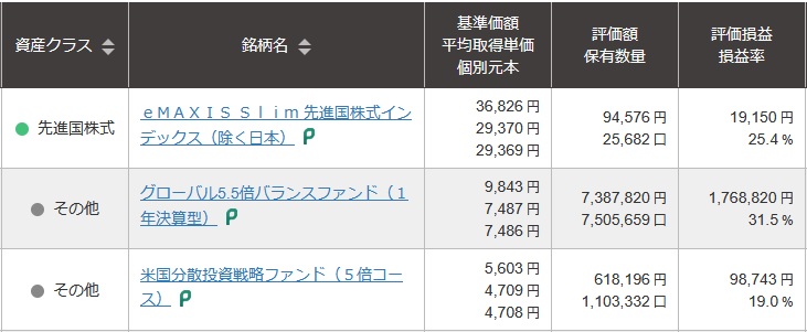 これはトワナナさんが松井証券さんで保有している、グローバル5.5倍バランスファンドの口数や評価額などの数字。(eMAXISは投資信託の保有ポイントを使い積まれたもの、米国分散投資戦略は別記事を参照。)