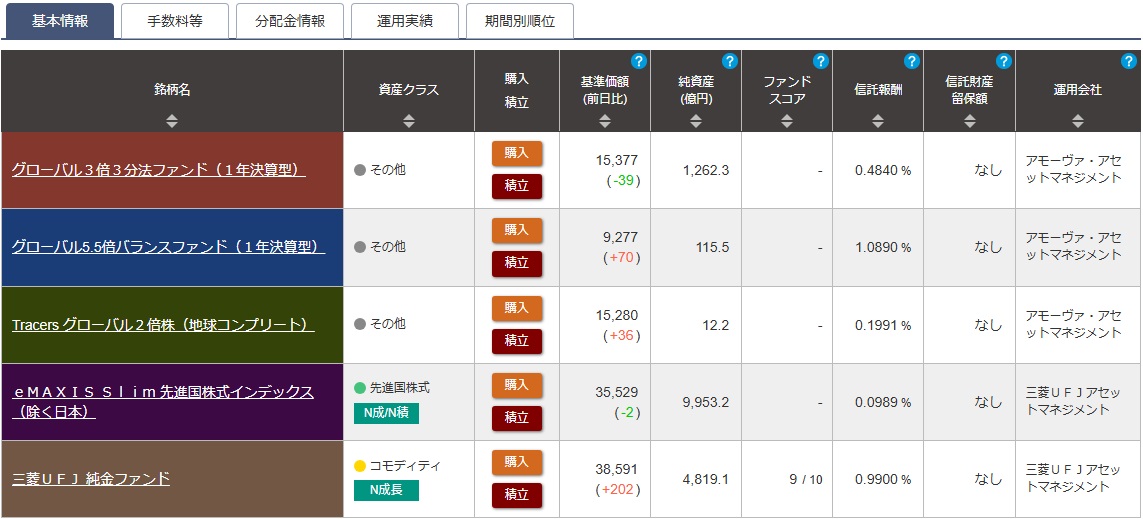 日付け | グローバル 3倍3分法 ファンド | グローバル 5.5倍バランス ファンド | Tracers グローバル 2倍株 | eMAXIS Slim 先進国株式 インデックス (除く日本) | 三菱UFJ 純金ファンド |