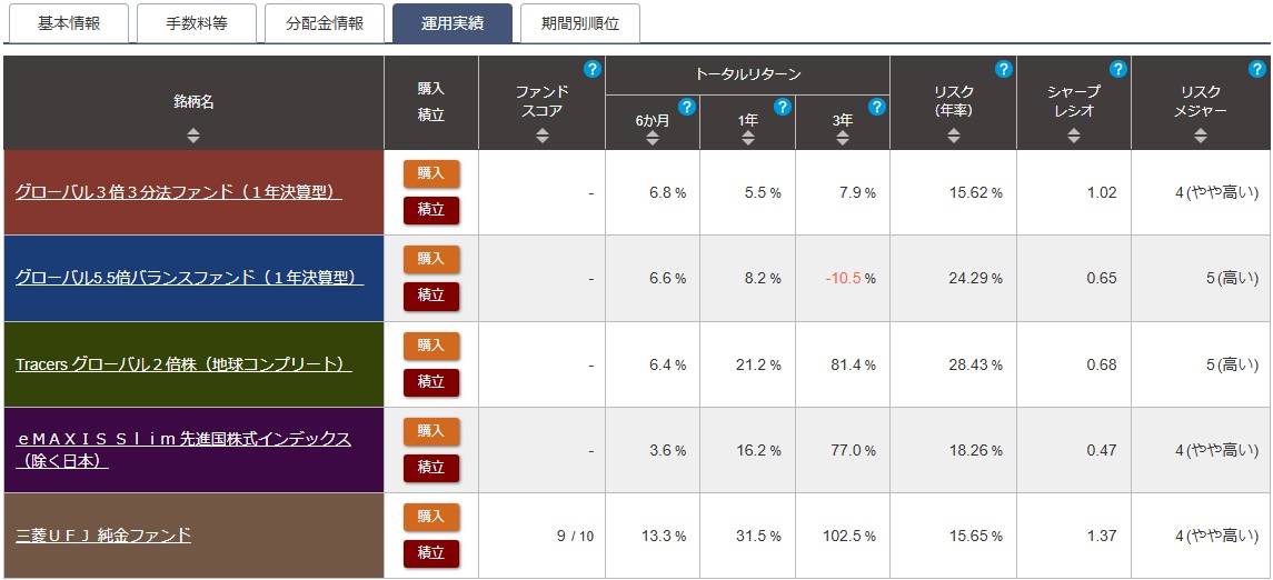 期間 | グローバル 3倍3分法 ファンド | グローバル 5.5倍 バランス ファンド | Tracers グローバル 2倍株 | eMAXIS Slim 先進国株式 インデックス (除く日本) | 三菱UFJ 純金ファンド |