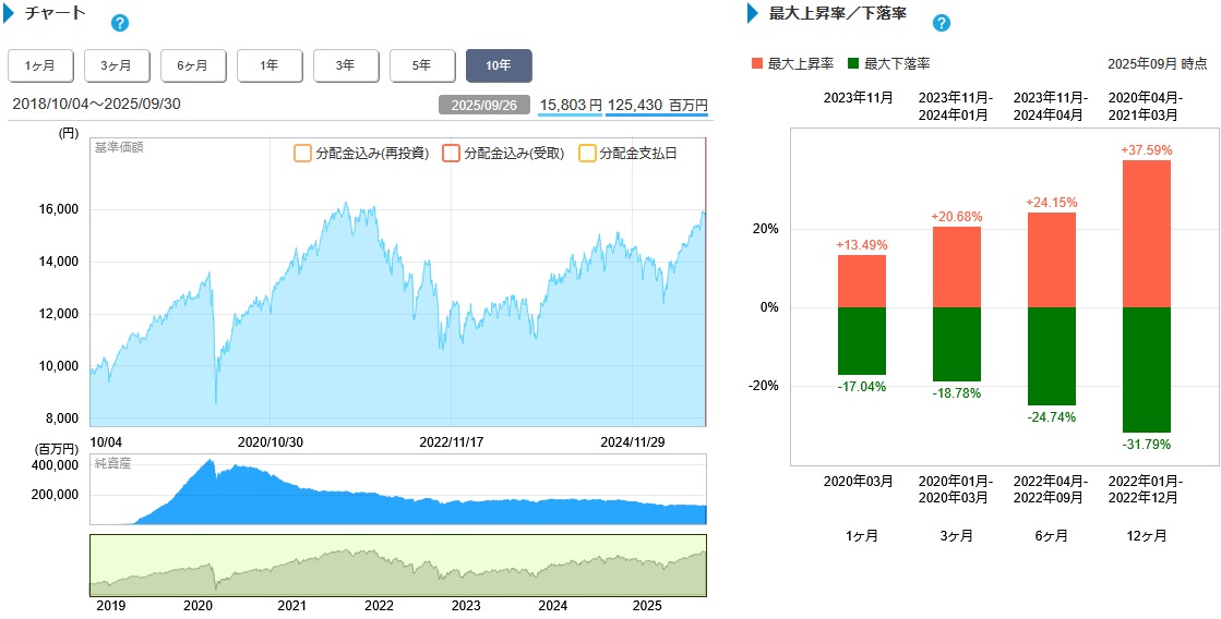 2025年10月9日、グローバル3倍3分法ファンドは設定来高値となる16,340円を記録。2021年から4年ぶりの更新となった。(前回の高値は2021年9月7日の16,295円かな?たぶん。)